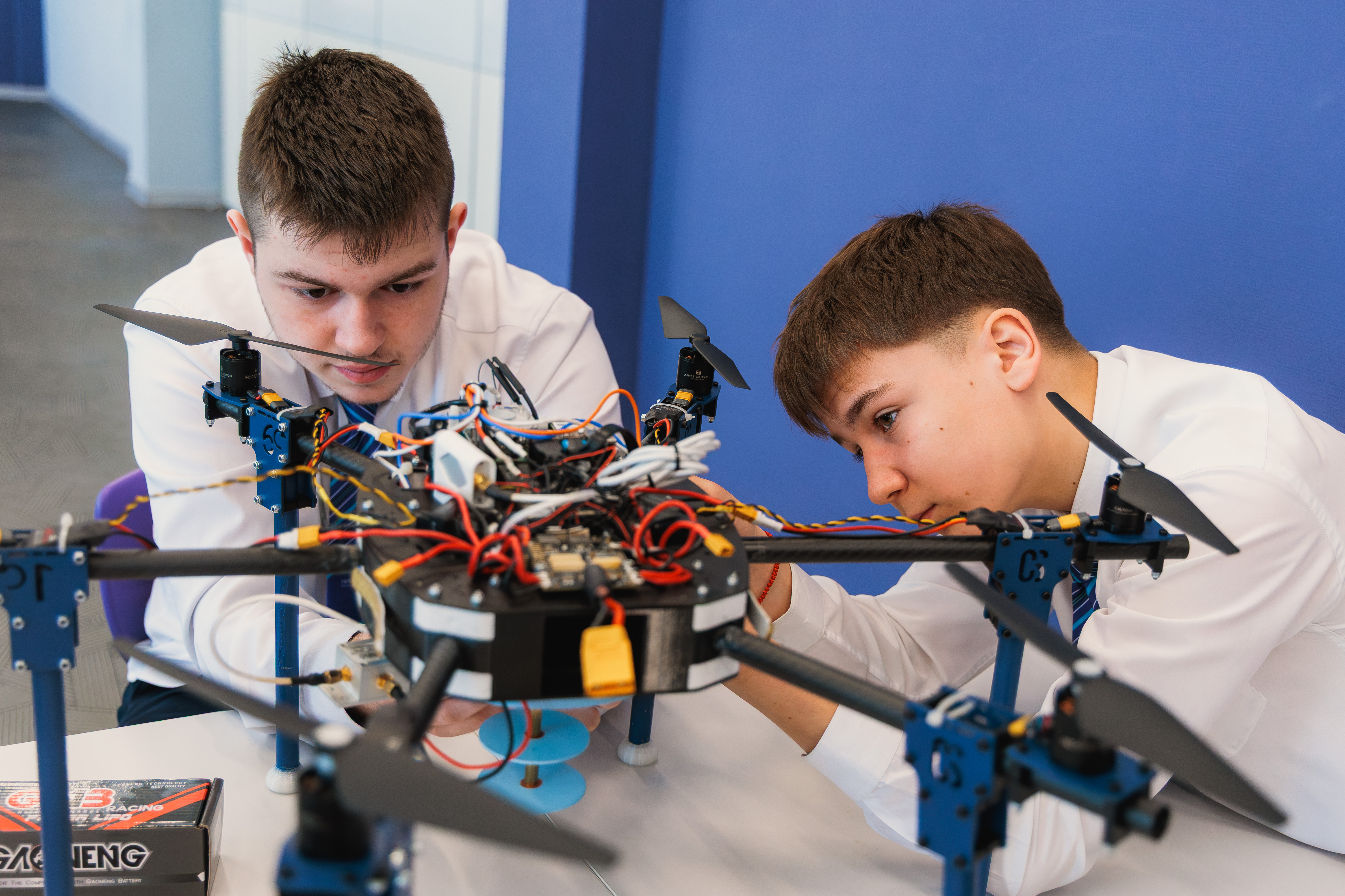 Здесь проходят полный цикл подготовки по управлению беспилотными летательными аппаратами: от конструирования и программирования до тренировок на симуляторах и реальных полетов на специально оборудованной трассе, для которой трансформирован один из четырех спортзалов.