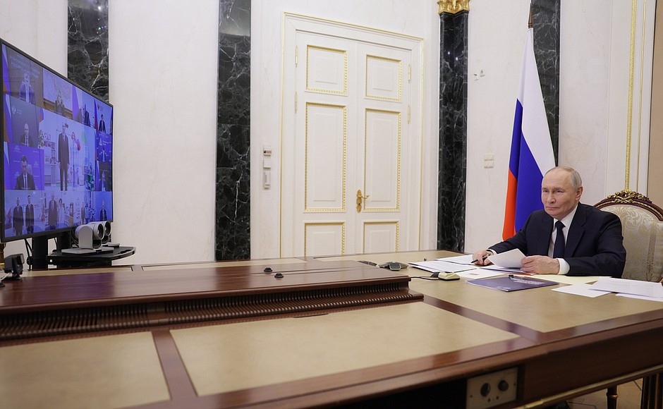 Президент РФ Владимир Путин в режиме видеоконференции провел совещание с членами Правительства РФ, посвященное вопросам обновления парка общественного транспорта, и открыл среднюю общеобразовательную школу «Открытие» в Суздале Владимирской области.